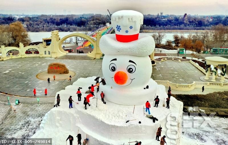 GLIX – Harbin, Heilongjiang Province of China. The snowman, with a height of over 20 meters, is nearly complete at the Sun Island scenic spot.