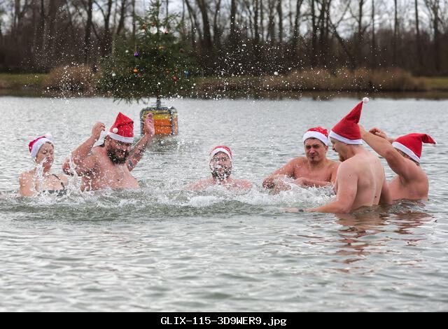 GLIX – Men and a woman in Santa hats swim in the Schwarzachtalsee in single-digit temperatures. A Christmas tree floats on a buoy in the background