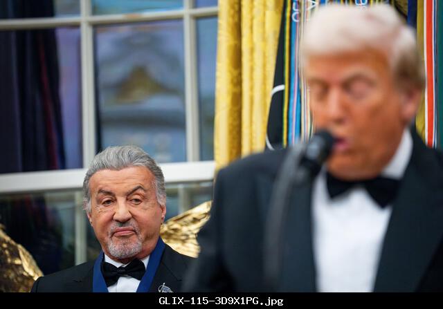 GLIX – Sylvester Stallone looks on after being presented a medal by United States President Donald J Trump as a 2025 Kennedy Center Honoree during a presentation ceremony in the Oval Office of the White House in Washington
