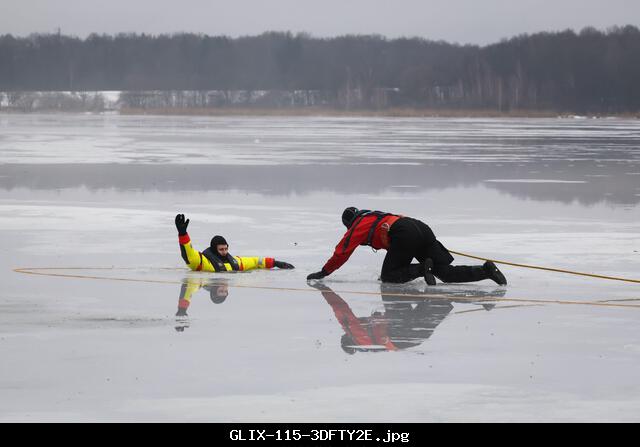 GLIX – Hamburg, Germany. 14th Jan, 2026. Emergency services and divers from the Hamburg Fire Brigade demonstrate rescue measures on the ice at a press event at Öjendorfer See. The Hamburg Fire Brigade provided information on Wednesday about dangers on the ice, accident prevention measures and help in an emergency. Credit: Christian Charisius