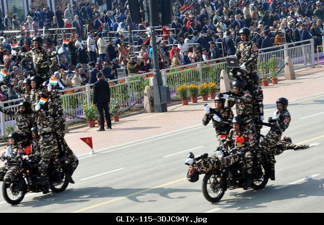 GLIX – INDIA. 26th Jan, 2026. Indian soldiers perform a motorcycle stunt during the country’s 77th Republic Day parade at Kartavya Path in New Delhi on January 26, 2026.