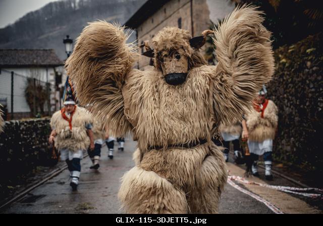 GLIX – Ituren, Spain. 26th Jan, 2026. Revelers wearing grotesque masks perform provocative satirical scenes in contrast to the order symbolized by the ”Joaldunak’s’ during the carnival of Zubieta and Ituren