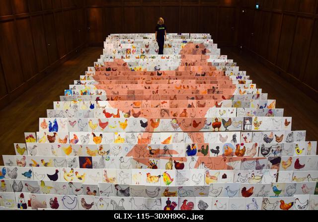 GLIX – 700 hand-drawn hens, each on an A4 piece of paper, are laid out as part of the ‘Draw The Line’ exhibition at St. Martin-in-the-Fields in Trafalgar Square. The drawings represent 7 million chickens kept in cages in the UK and the size of the paper highlights the approximate amount of space laying hens are confined to in a cage. The exhibiton is presented by the animal welfare group Compassion in World Farming and includes drawings from Dame Joanna Lumley, Chris Packham, Deborah Meaden and Miriam Margoyles, among many others.
